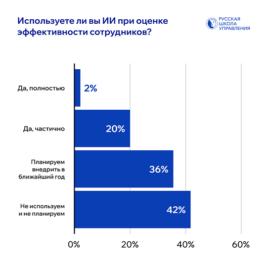 Впрочем, даже там, где ИИ внедрен, его применение ограничено. Например, оценку эффективности сотрудников полностью доверяют ИИ всего 2% компаний, частично — 20%. При этом 36% планируют внедрить такие решения в течение года, а 42% вовсе не рассматривают этот вариант.