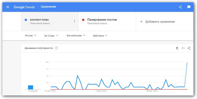 В Google Trends можно сравнить показатели по разным запросам: